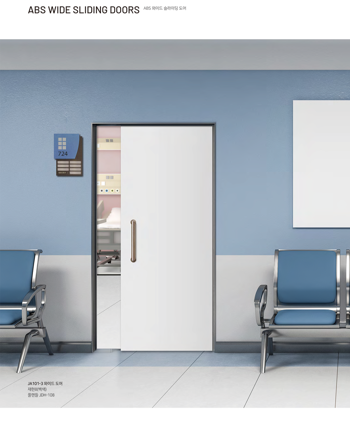 ABS 와이드 슬라이딩 도어는 개구부가 넓은 병원, 요양원 등 특수장소에 적용되는 도어입니다.