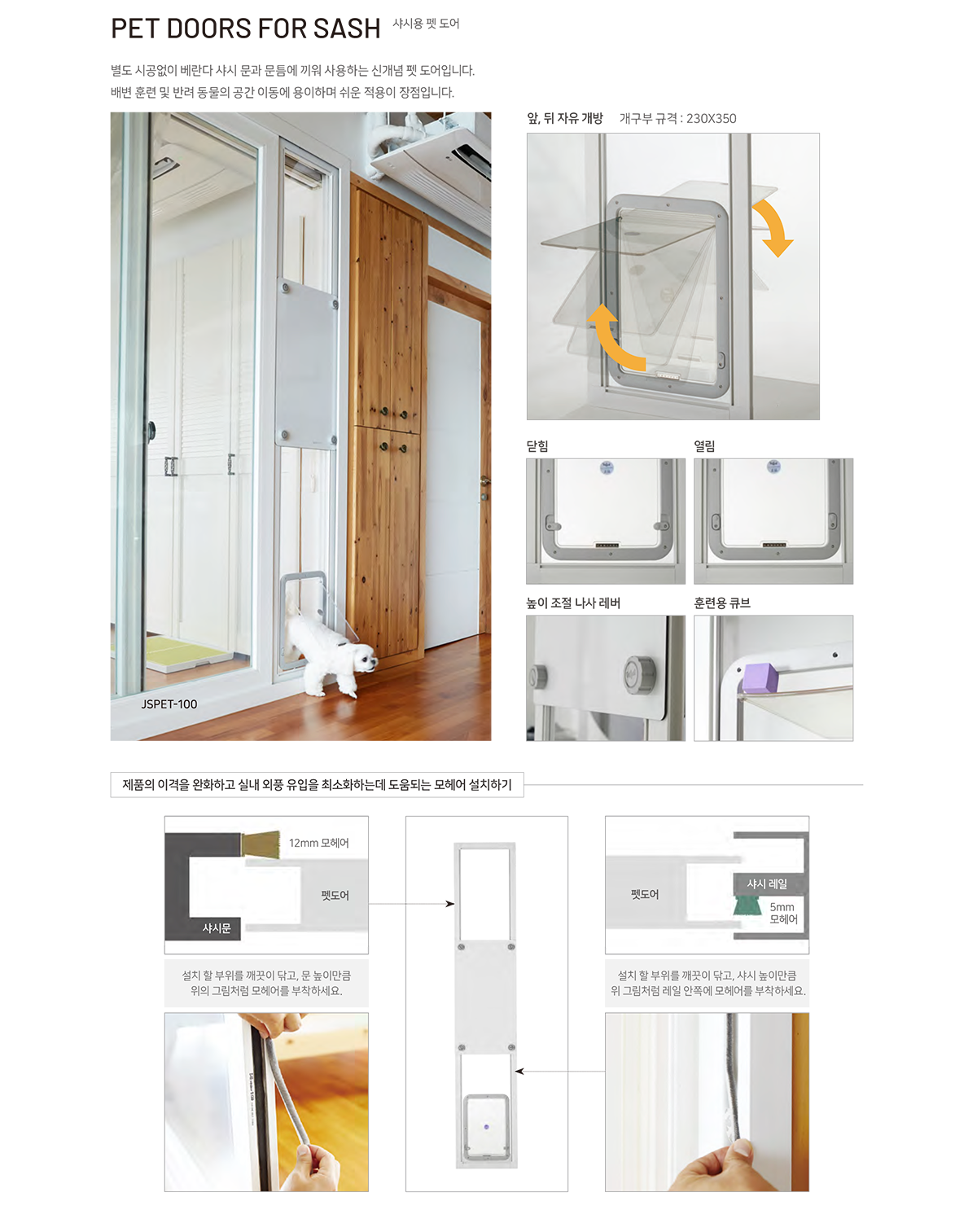 별도 시공없이 베란다 샤시 문과 문틈에 끼워 사용하는 신개념 펫 도어입니다.